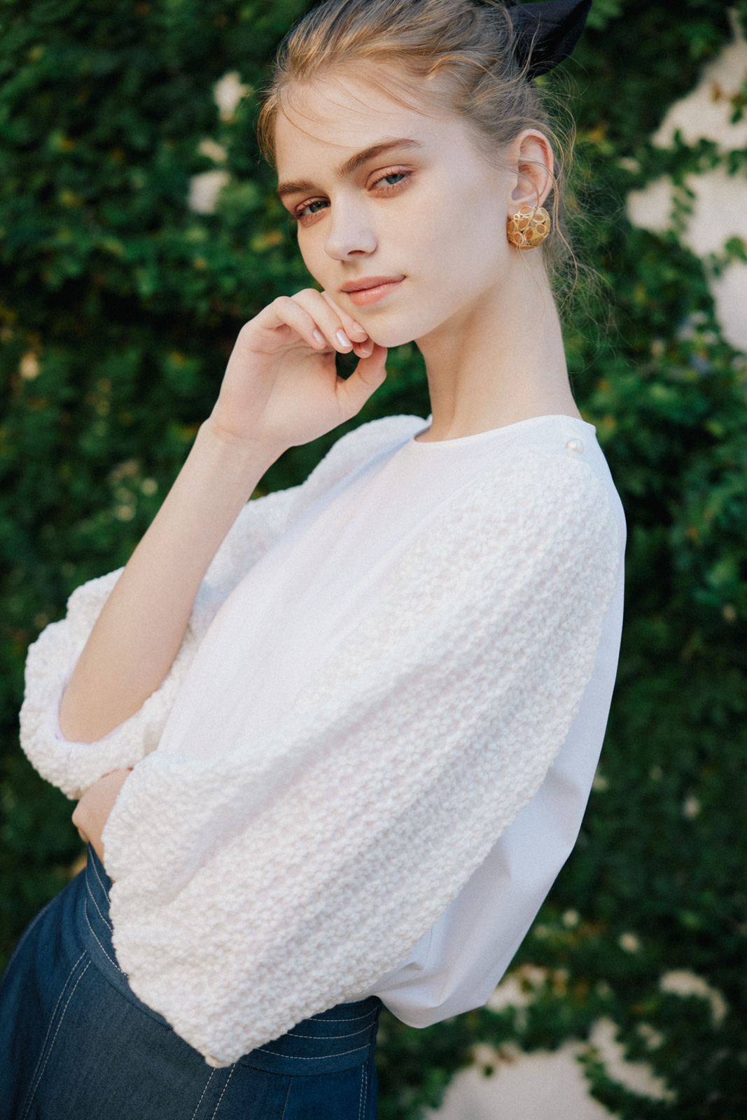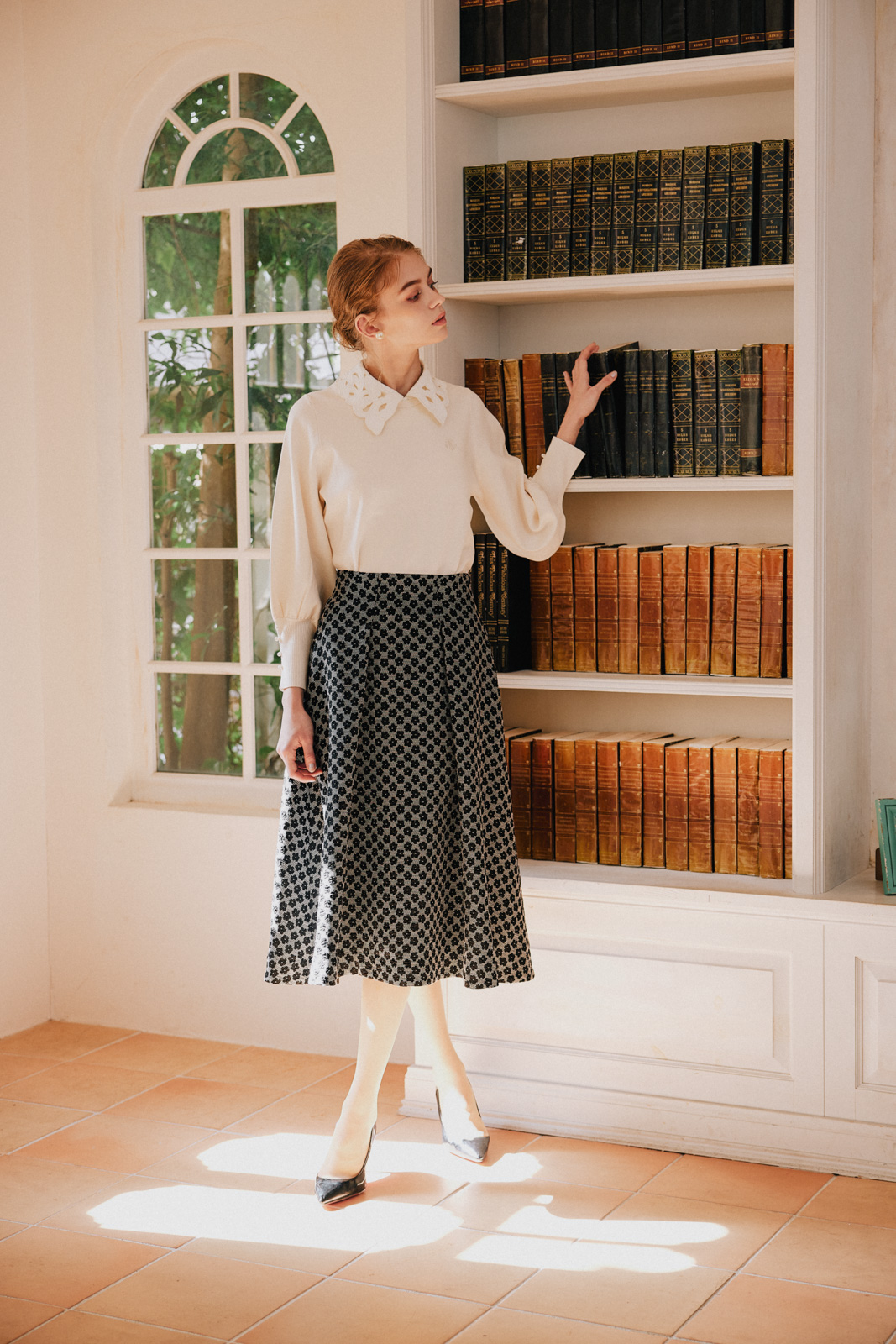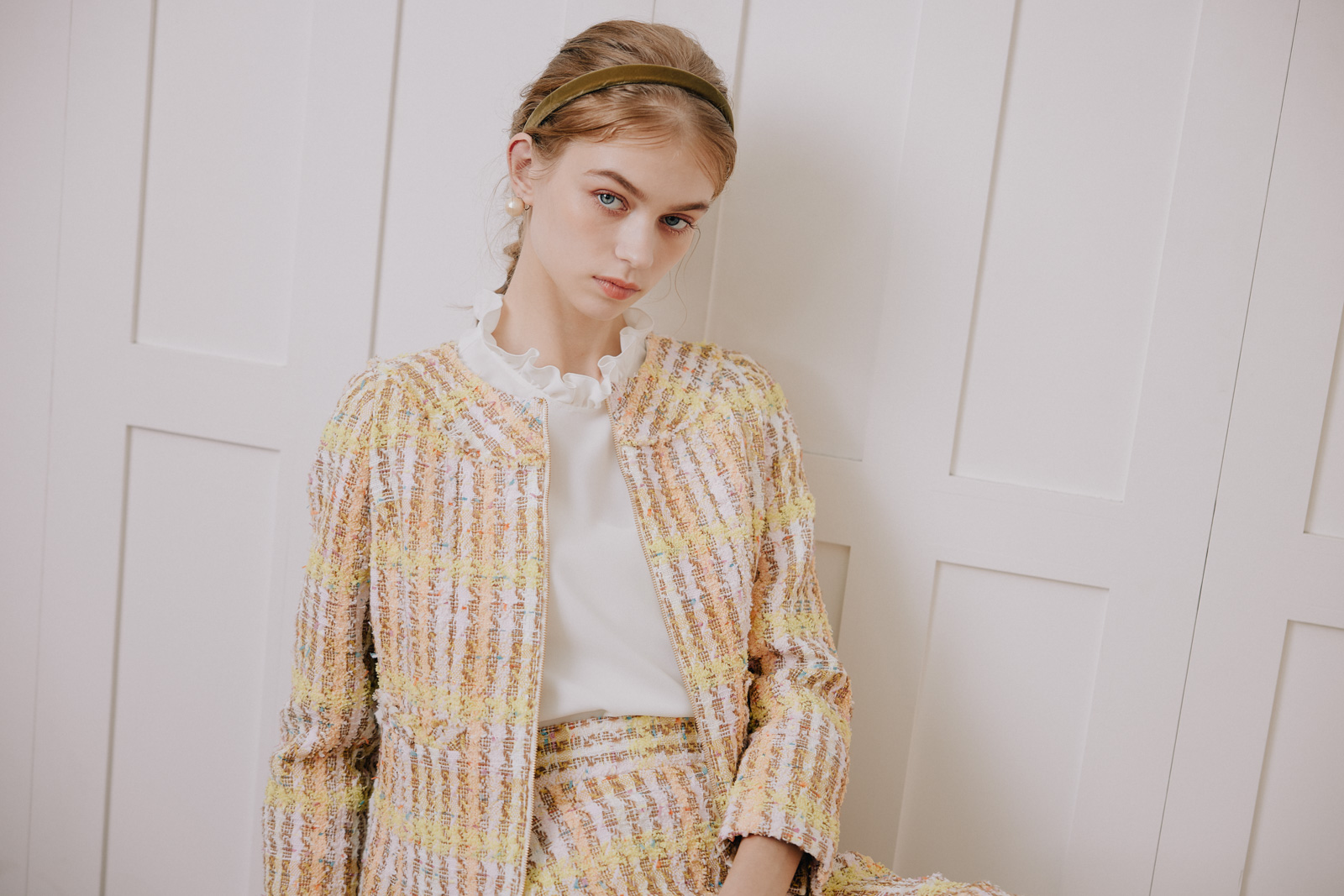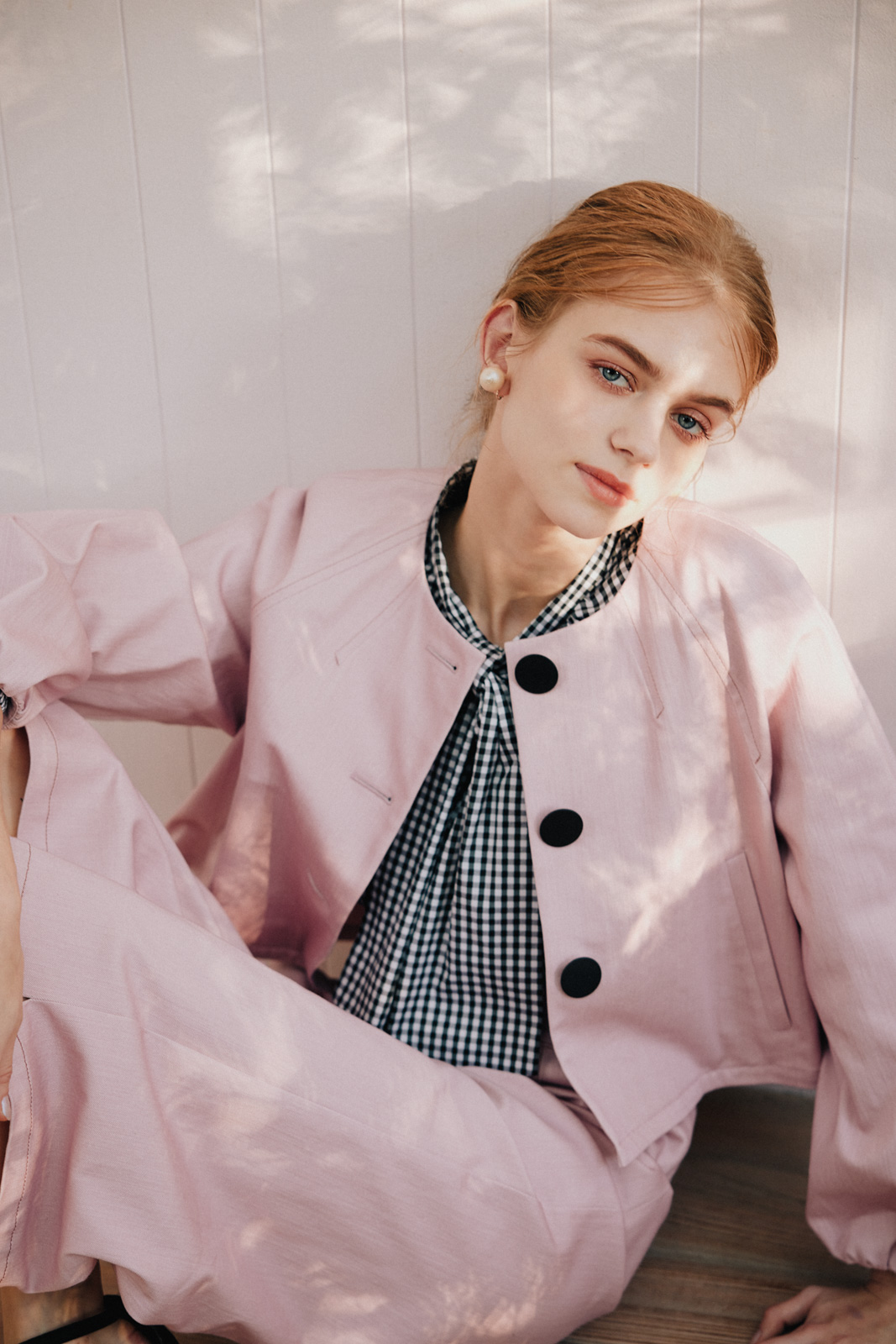 各ルックごとにハウススタジオでの自然光を生かしつつ、多数の照明を使用して設計。素材の質感——ツイードの粒立ち、レースの透過、ニットの肉厚さ——が正確に伝わる光を組んだ。グレーディングでは淡色の階調を精密に保ちつつ、彩度を上げるのではなく光の質を整えることで「明るいが落ち着いている」というトーンに着地。ブランドが持つ「甘くない上質さ」を、写真のトーンとして定義した。