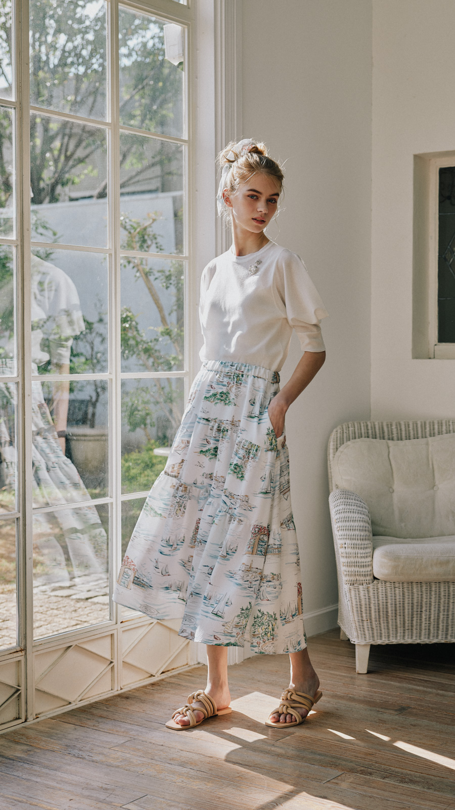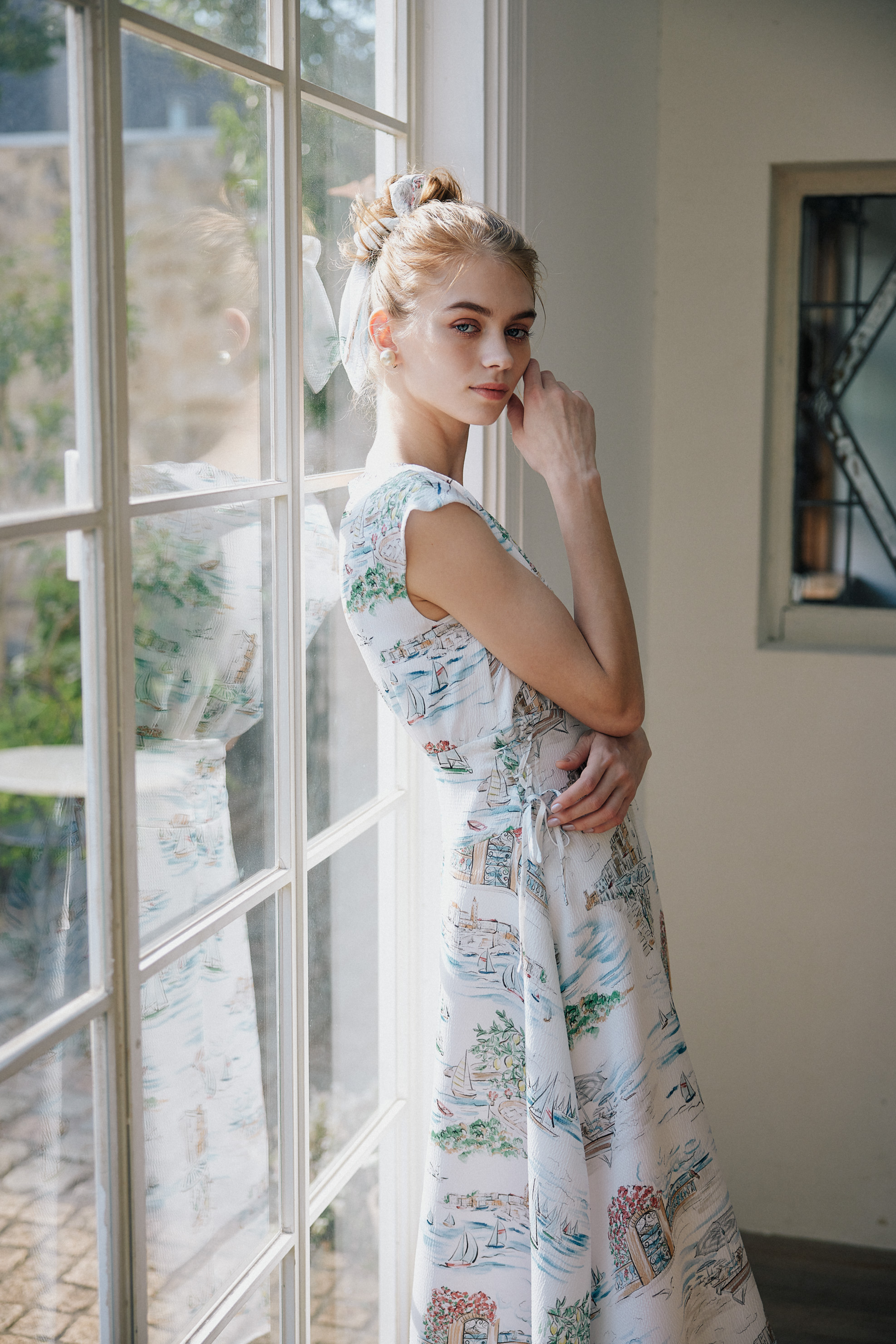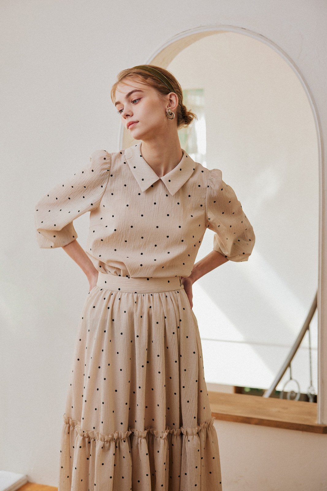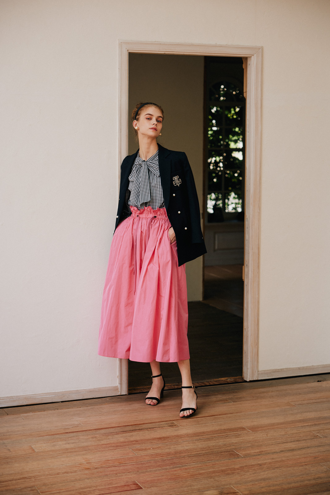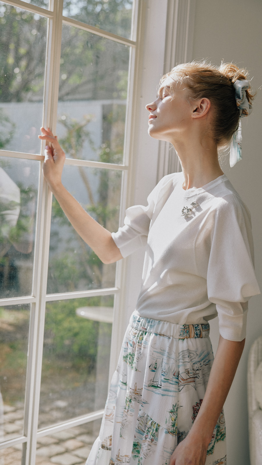 各ルックごとにハウススタジオでの自然光を生かしつつ、多数の照明を使用して設計。素材の質感——ツイードの粒立ち、レースの透過、ニットの肉厚さ——が正確に伝わる光を組んだ。グレーディングでは淡色の階調を精密に保ちつつ、彩度を上げるのではなく光の質を整えることで「明るいが落ち着いている」というトーンに着地。ブランドが持つ「甘くない上質さ」を、写真のトーンとして定義した。