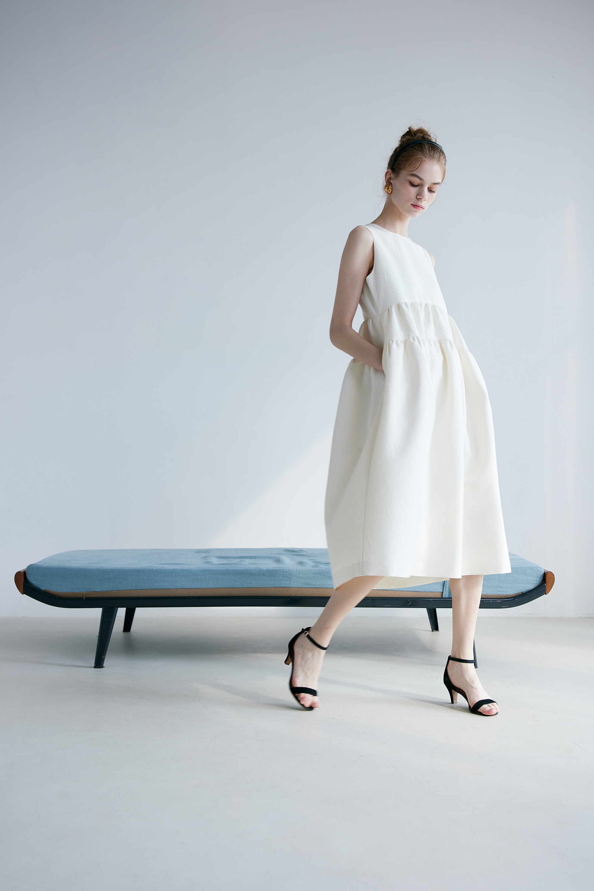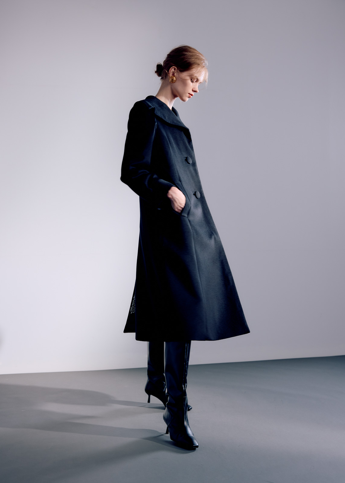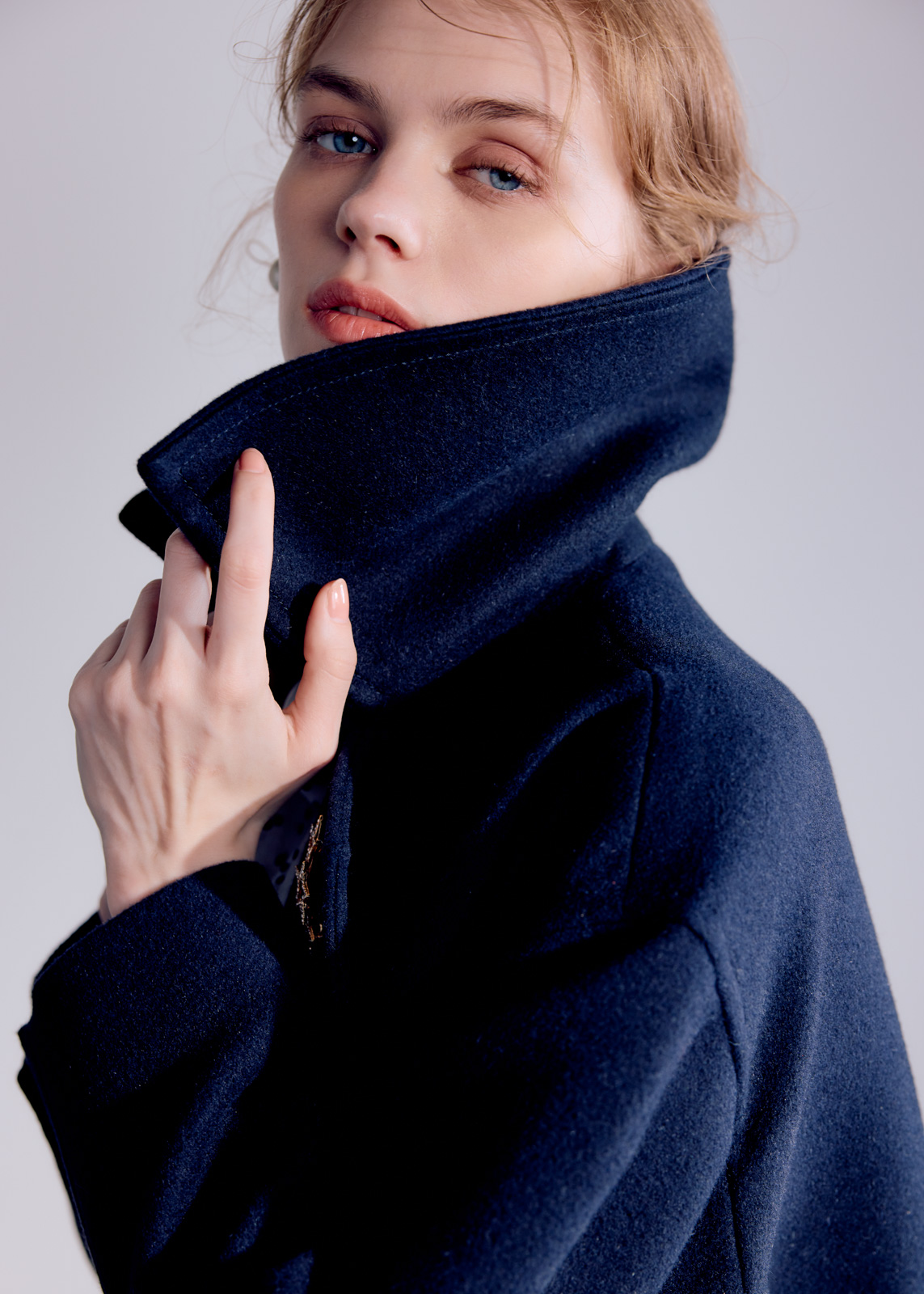 冷暖の光を意図的に使い分けた。ウールやファーなど暖かみのある素材には、あえてクールな光を当てて甘さを抑制し、構造としての強度を引き出す。逆にシャープな仕立てのアイテムには自然光の柔らかさを重ねて、冷たくなりすぎない着地点を探った。素材ごとに「光の温度」を変えることで、大人の構成と柔らかさを同居させている。