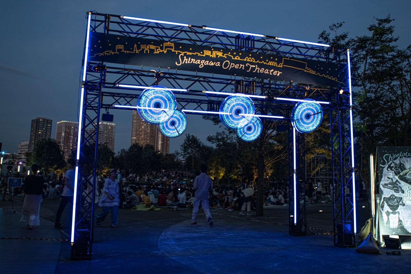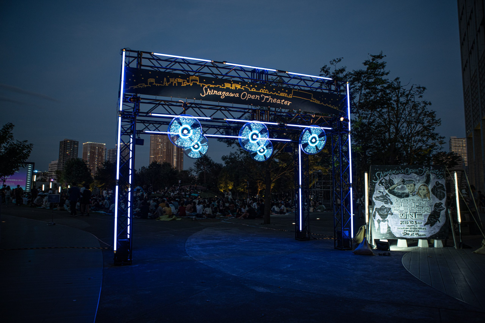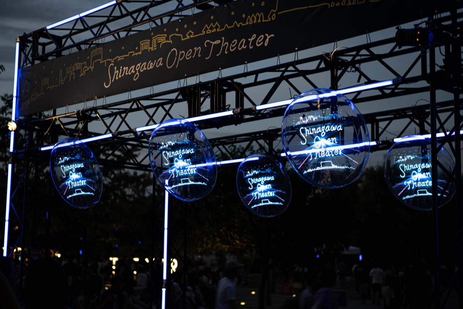 野外上映イベントの入場ゲート演出。映画を「観る」体験は上映開始で始まるのではなく、会場に足を踏み入れた瞬間から設計できる。回転LEDによる空中表示デバイス「3D Phantom」を複数台使用する条件があったが、機材の珍しさだけでは一過性の驚きで終わる。装置の物理特性を演出の文法として組み込み、来場者の意識を日常から作品世界へ接続する導線を設計する必要があった。